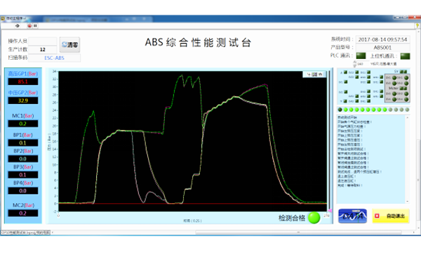 檢測(cè)臺(tái)由封堵夾具、測(cè)試系統(tǒng)、數(shù)據(jù)采集系統(tǒng)以及質(zhì)量追溯系統(tǒng)組成,配置有產(chǎn)品裝夾機(jī)構(gòu)、產(chǎn)品封堵及配氣機(jī)構(gòu)、產(chǎn)品配電機(jī)構(gòu)、氣壓測(cè)試系統(tǒng)、數(shù)據(jù)采集及分析系統(tǒng)等。測(cè)試臺(tái)采用高壓氮?dú)庾鳛闇y(cè)試介質(zhì),改變傳統(tǒng)的制動(dòng)液測(cè)試,減少制動(dòng)液對(duì)產(chǎn)品及生產(chǎn)環(huán)境的影響。通過密封性測(cè)試、電磁閥響應(yīng)測(cè)試、柱塞泵功能測(cè)試、蓄能器活塞測(cè)試等相關(guān)的部件功能測(cè)試和總成功能測(cè)試實(shí)現(xiàn)產(chǎn)品的性能判斷。